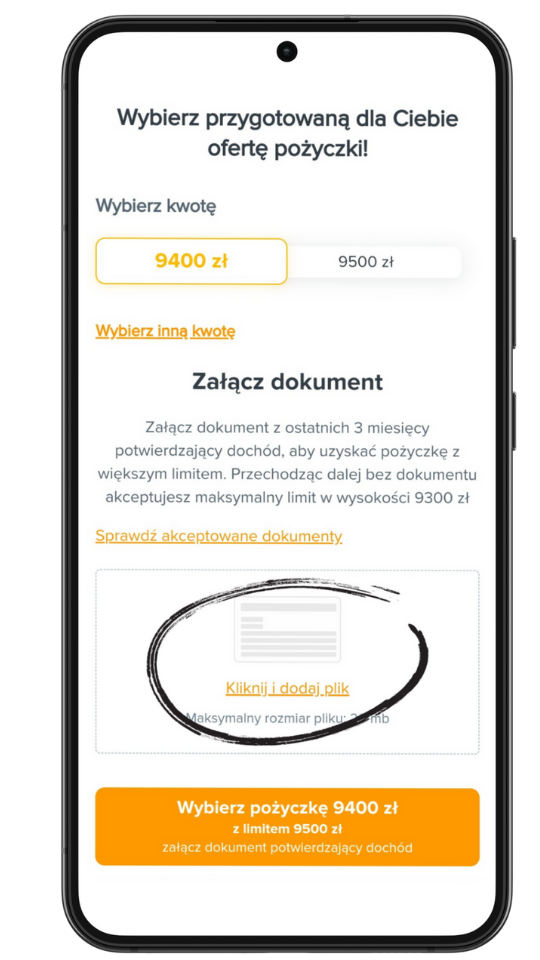 Wnioskując o wyższe kwoty pożyczek, możesz spotkać się z prośbą o załączenie dokumentu potwierdzającego Twój dochód. Rozumiemy, że nowa procedura może powodować pewne trudności, dlatego przygotowaliśmy szczegółową instrukcję, która krok po kroku wyjaśnia proces dodawania dokumentów zarówno na Twoim telefonie, jak i komputerze.